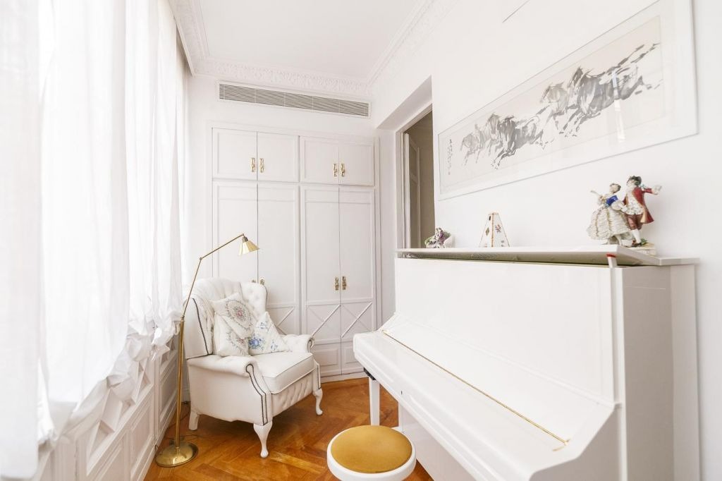 В квартирі просторий хол, що розділяє денну та нічну зони. Вітальня з двома балконами пропонує живописний вид на університетські сади, надаючи спокійне оточення в серці міста. Інтер’єр оформлений з високими стелями, ліпниною та вітражними вікнами, що надає приміщенню аристократичну атмосферу. Кухня обладнана побутовою технікою преміум-класу і з’єднана з затишною гостевою спальнею, яка може слугувати кабінетом або зоною відпочинку.