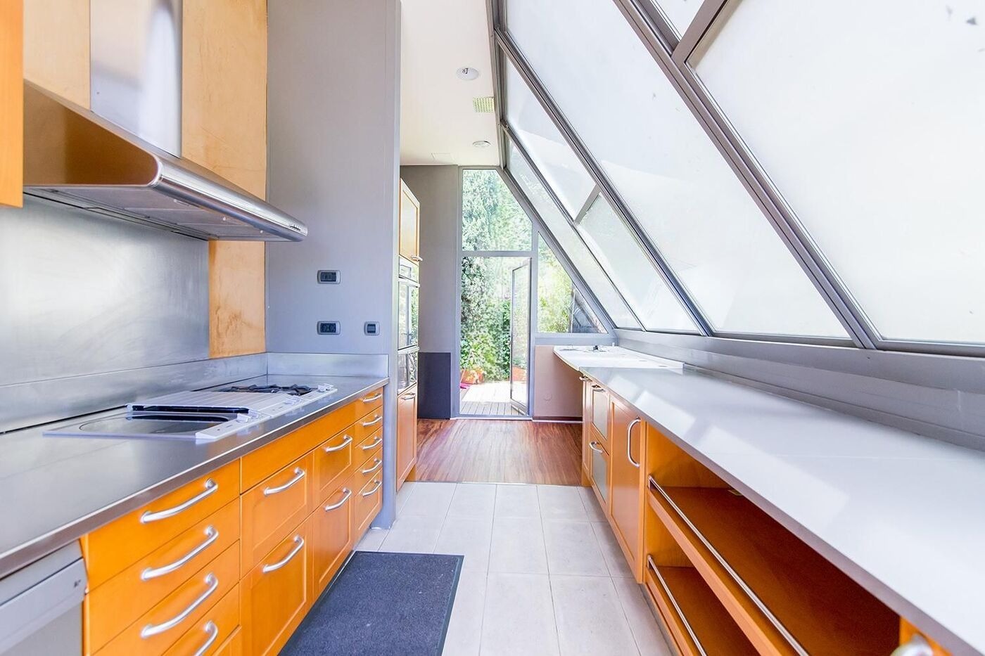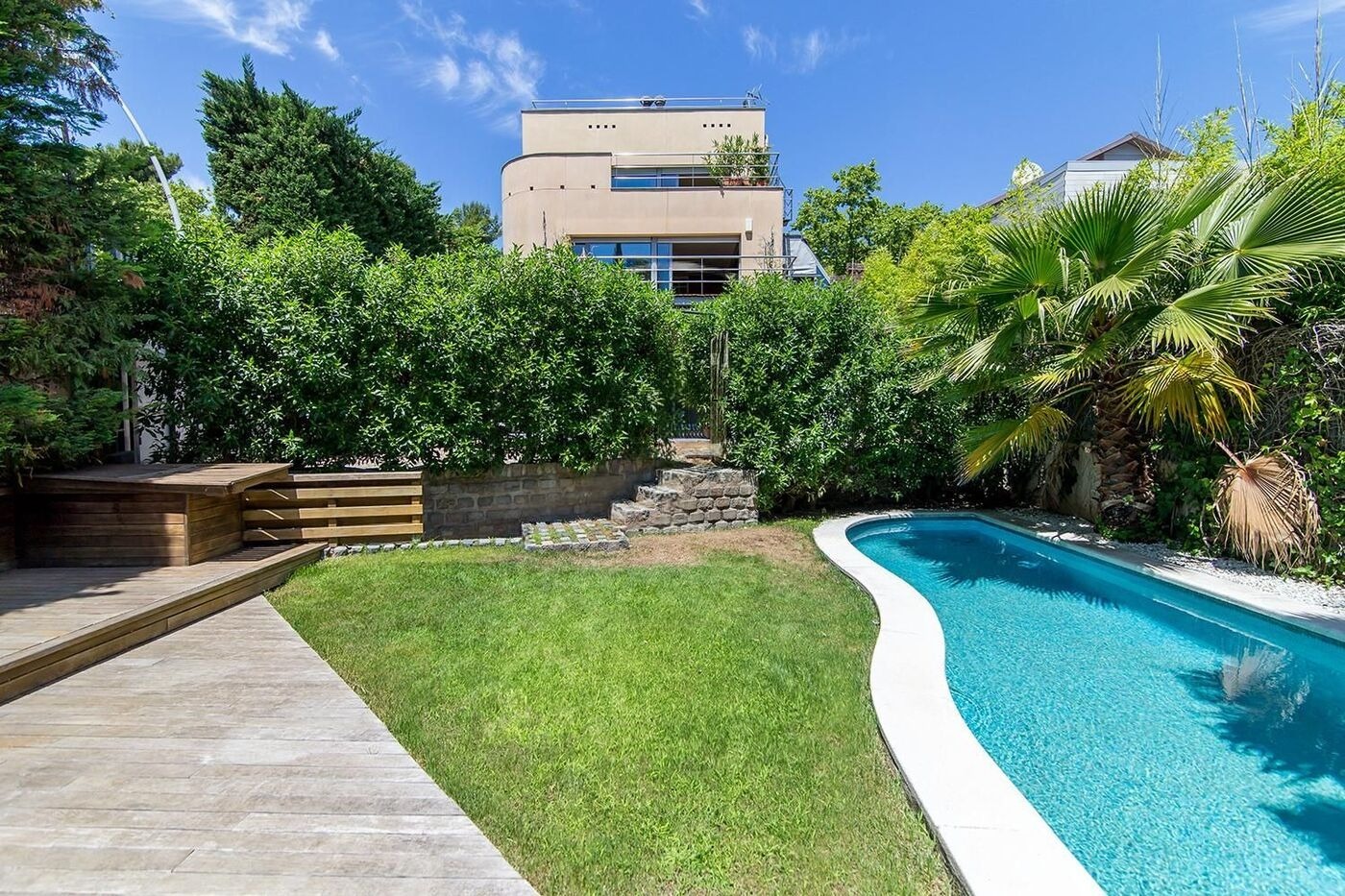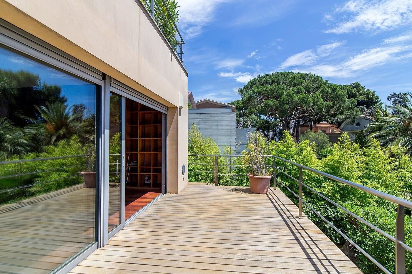 На головному поверсі знаходиться світла вітальня з каміном, зона столової, а також зовсім нова кухня з сучасними приладами та великими вікнами, що забезпечують хороший світло. Тут також розташовується гостьовий туалет і сонячна тераса, яка веде в сад. На верхньому рівні знаходиться головна майстер-люкс з двома гардеробними та ванною кімнатою з джакузі, звідки відкриваються живописні види на місто та море з тераси площею 30 м².