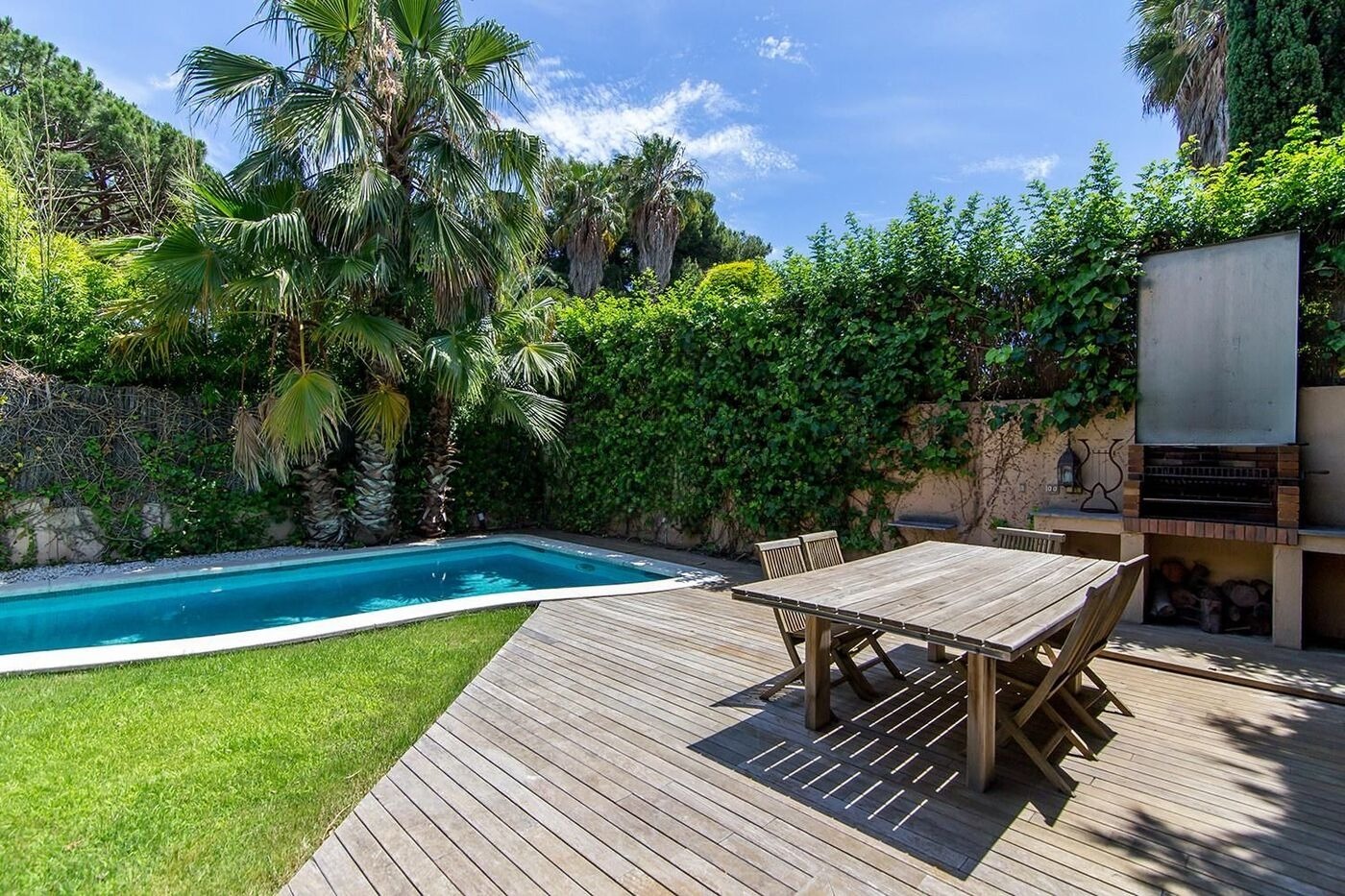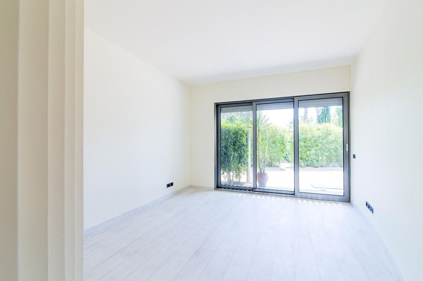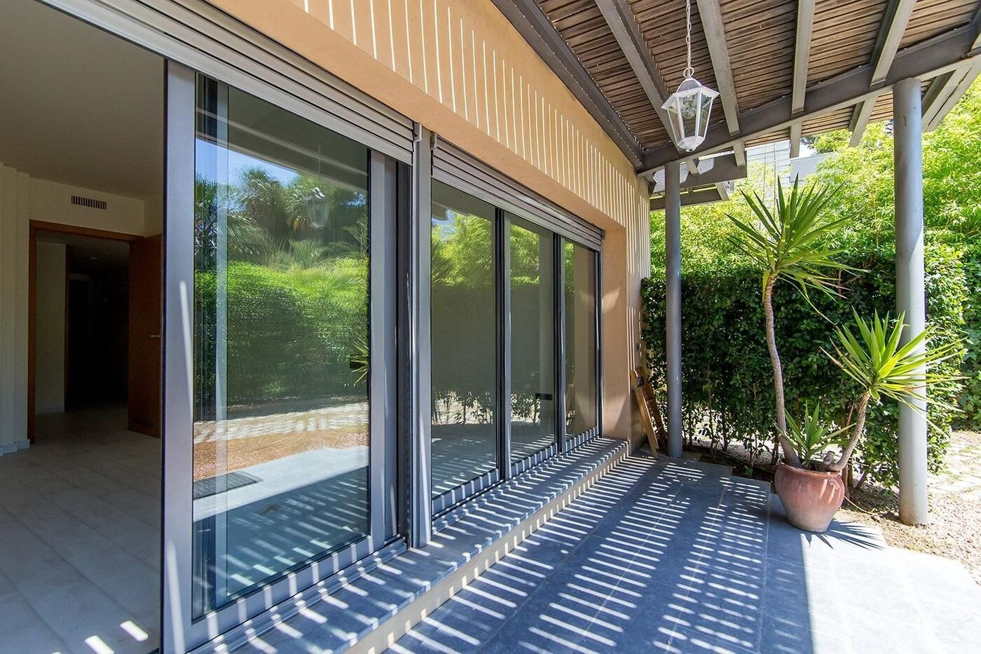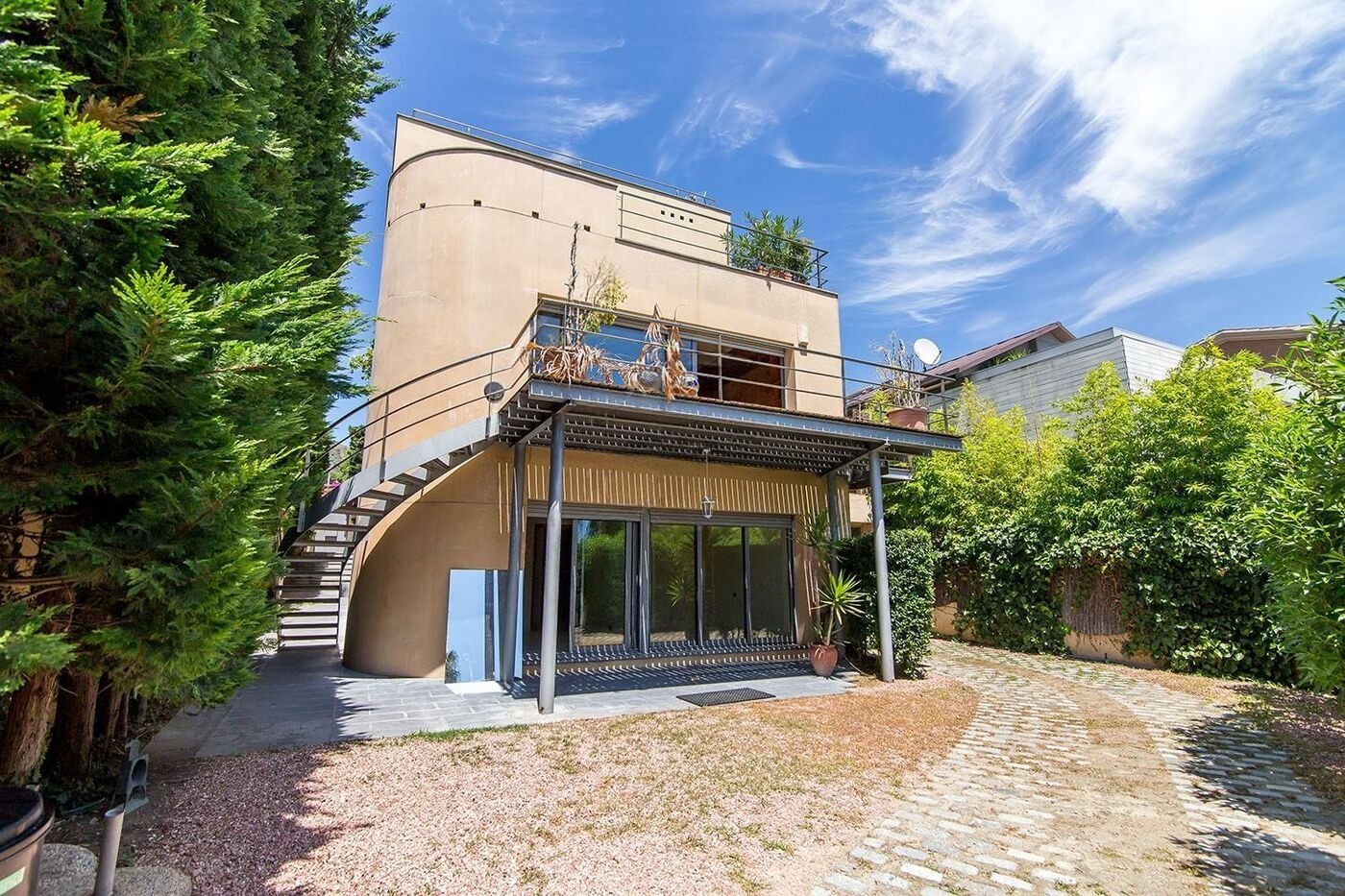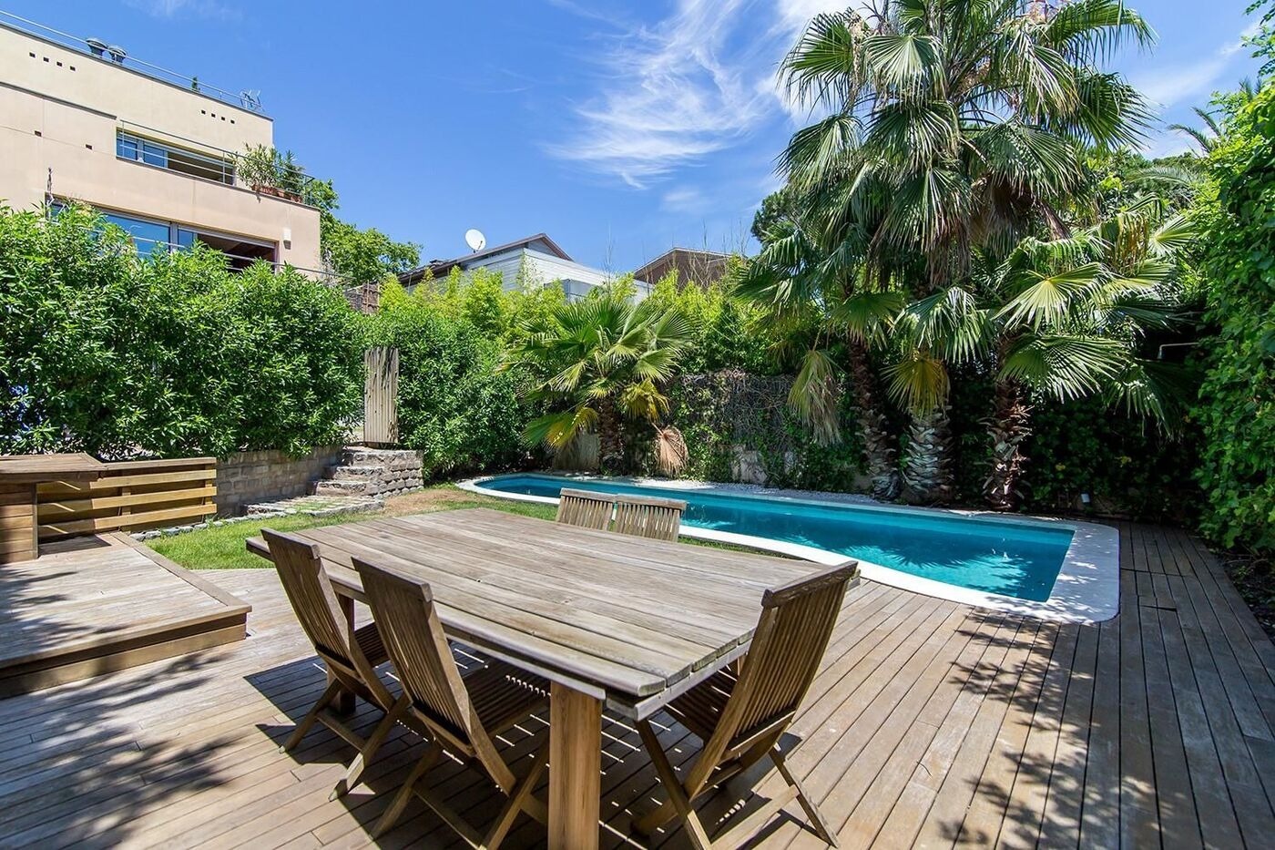 На нижньому рівні розташовані дві спальні з виходом у сад, третя кімната, дві просторий ванні кімнати, пральня та гараж на два автомобіля. Приватна ділянка включає доглянутий сад з пальмами, басейн, зону для барбекю та внутрішню сауну. Будинок оснащений теплими підлогами, системою кондиціонування, паркетом та електричними жалюзі, що створює атмосферу затишку та комфорту.