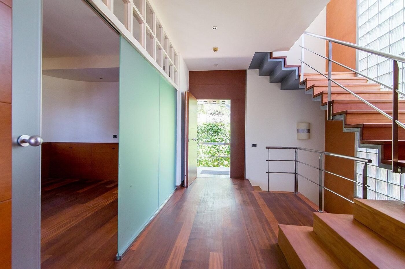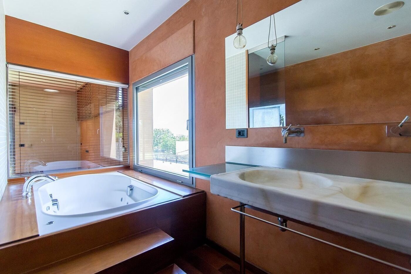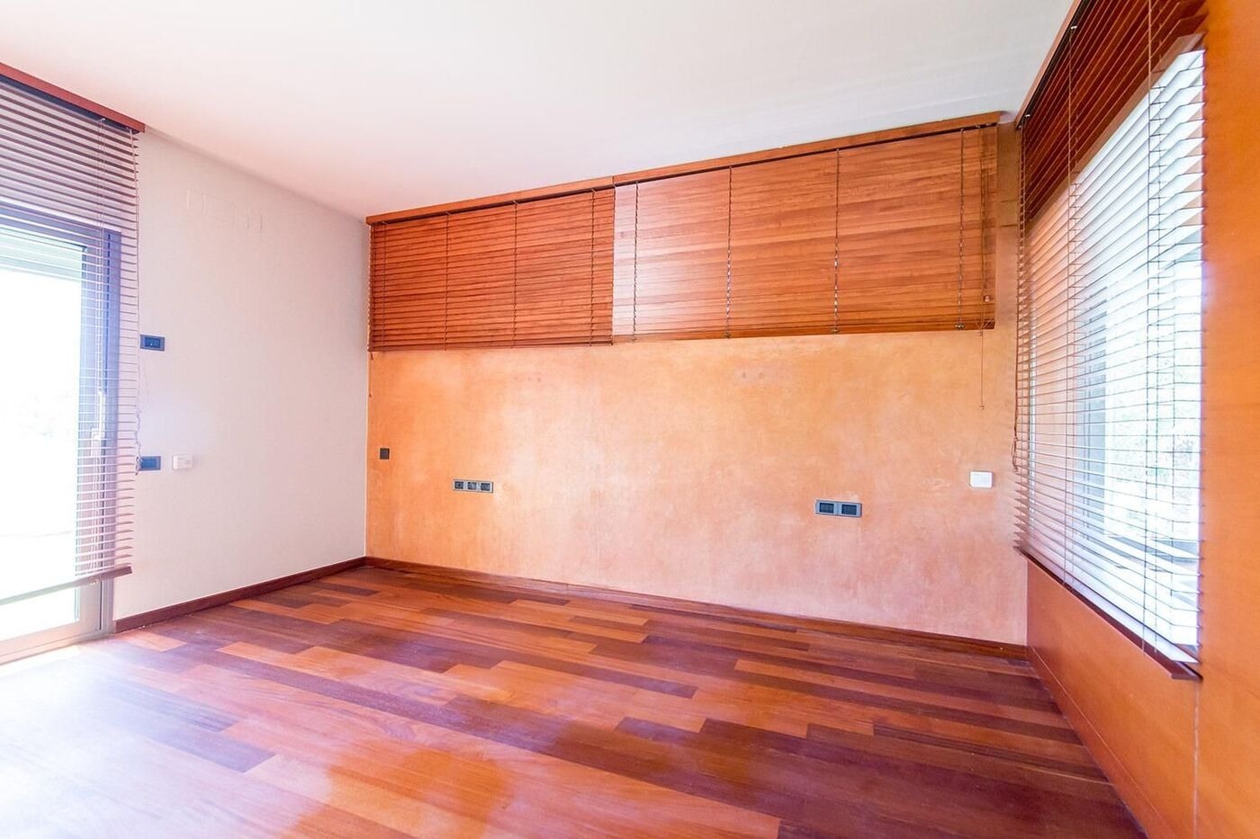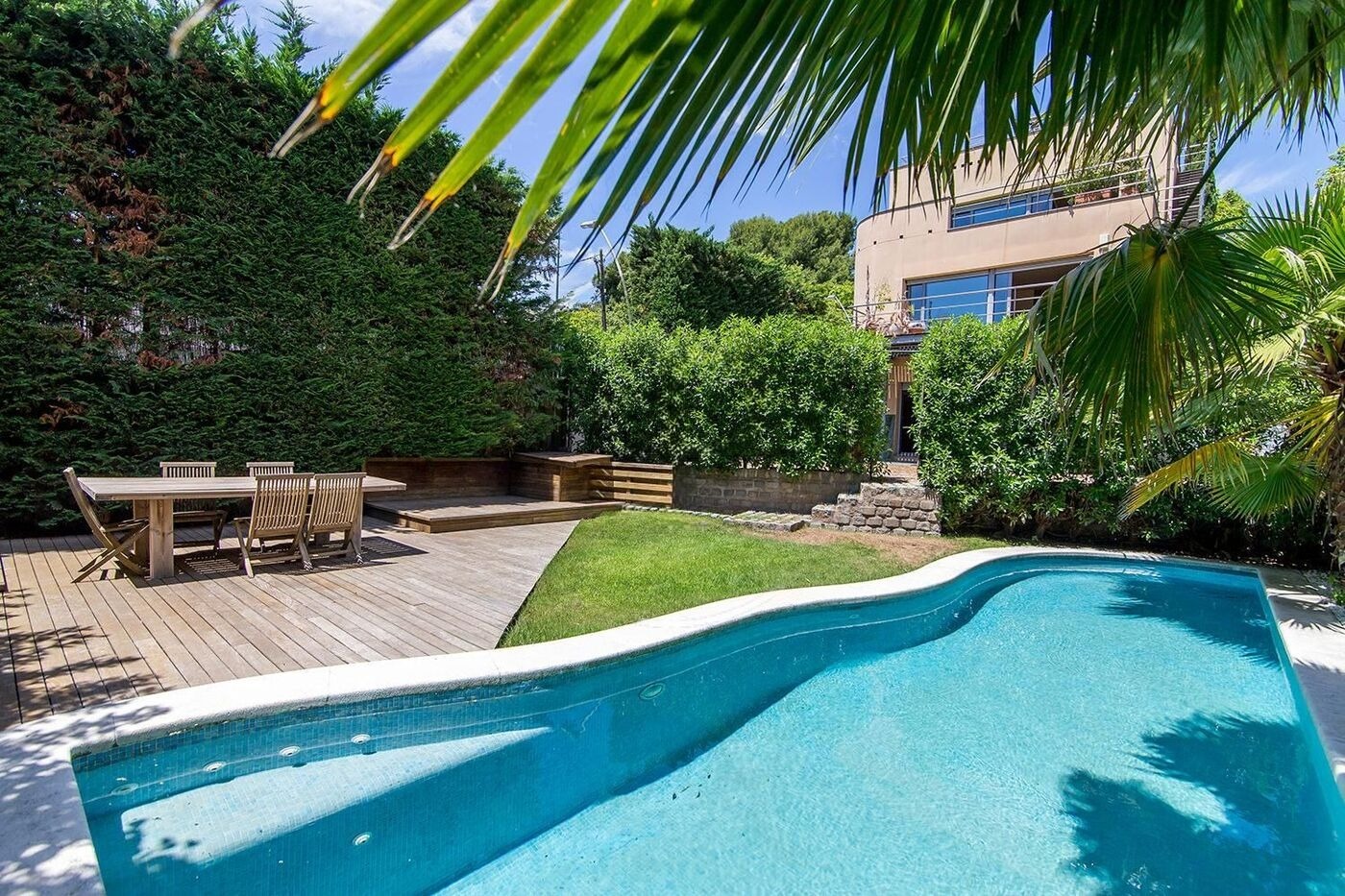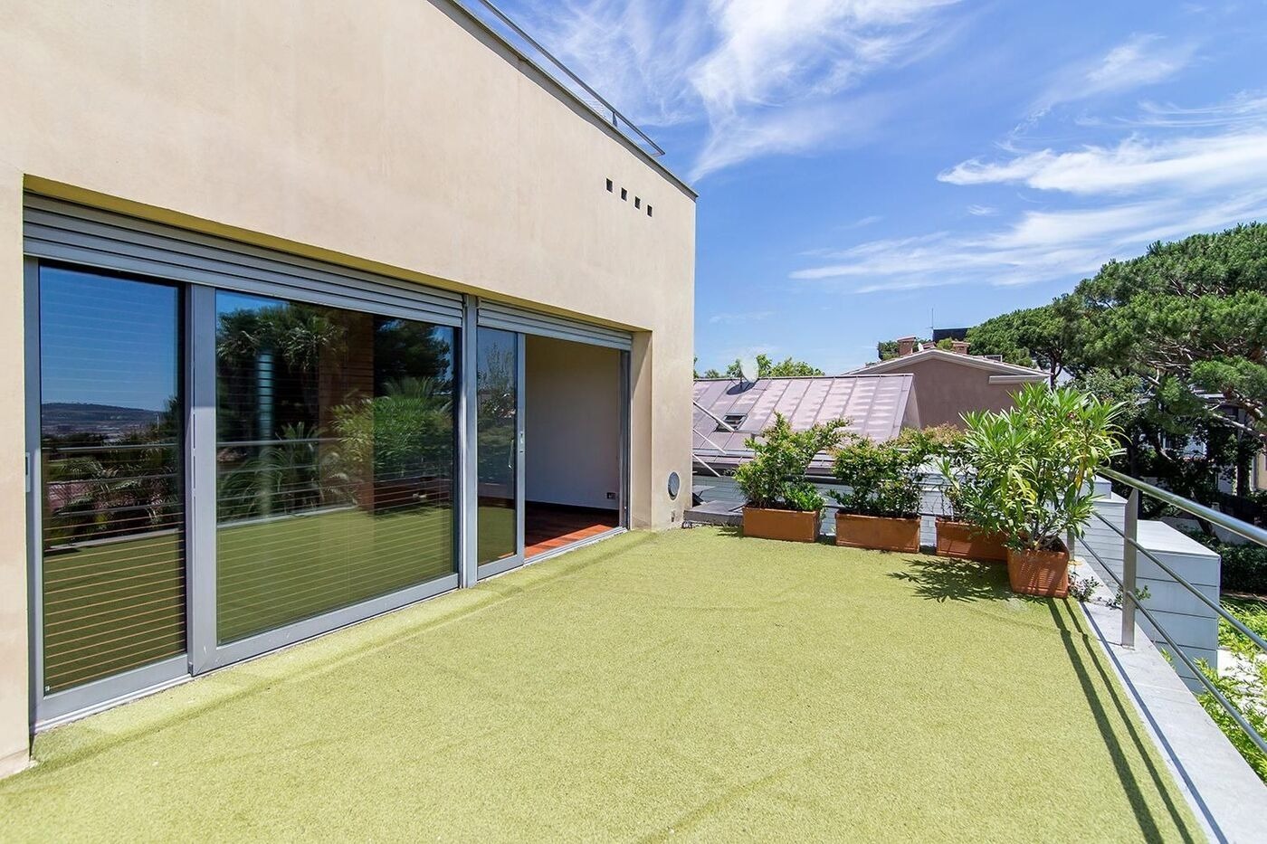 На нижньому рівні розташовані дві спальні з виходом у сад, третя кімната, дві просторий ванні кімнати, пральня та гараж на два автомобіля. Приватна ділянка включає доглянутий сад з пальмами, басейн, зону для барбекю та внутрішню сауну. Будинок оснащений теплими підлогами, системою кондиціонування, паркетом та електричними жалюзі, що створює атмосферу затишку та комфорту.