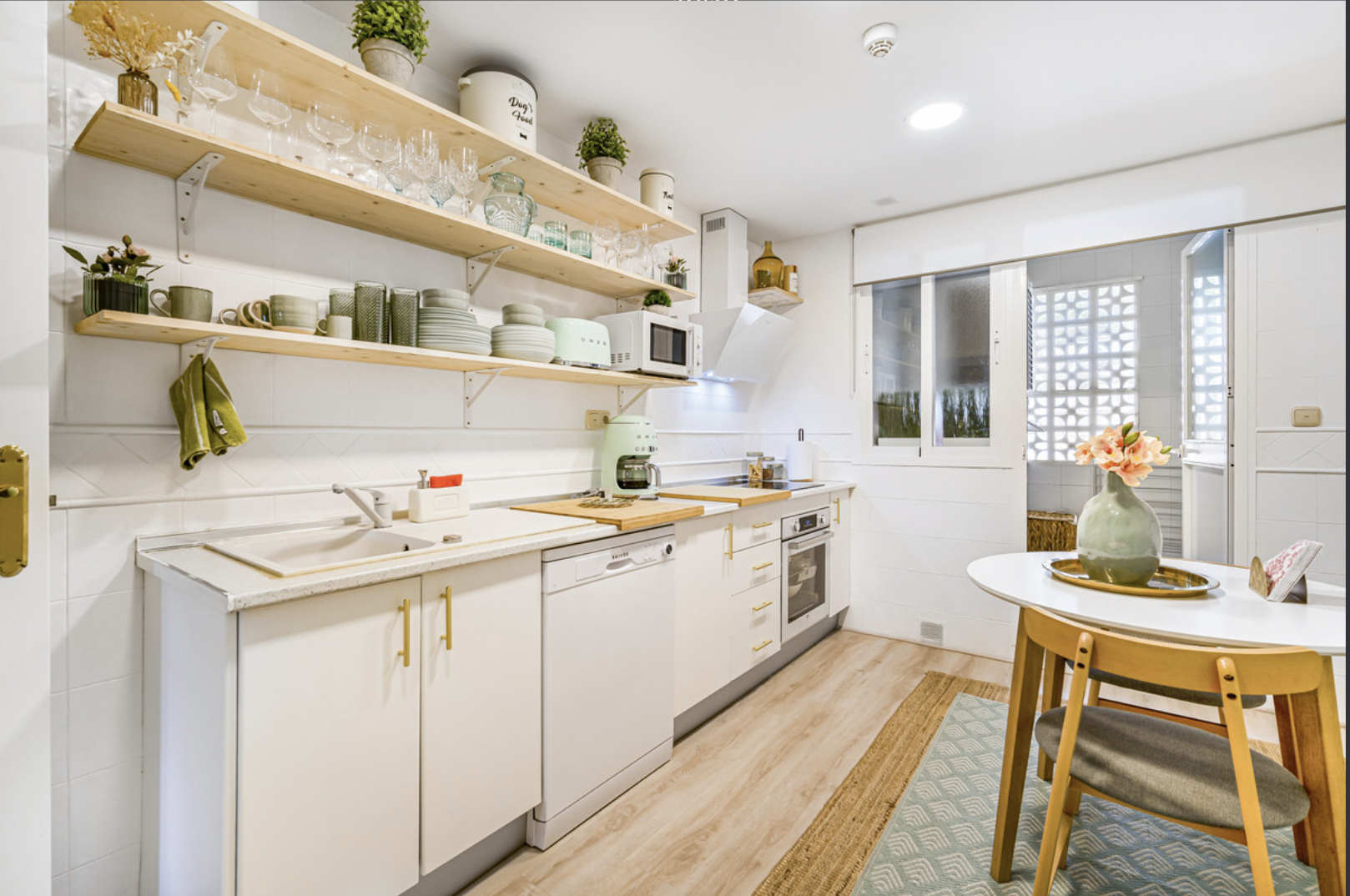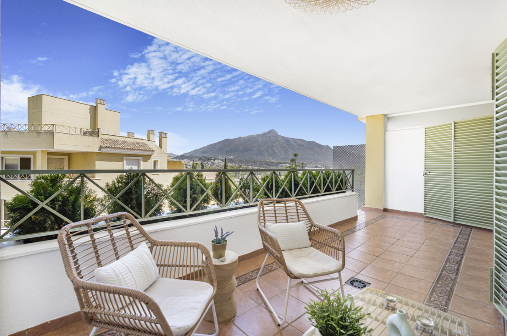 Квартира включає в себе світлу відкриту вітальню та столову з виходом на терасу, звідки відкривається доступ у приватний сад з чудовими видами на гори. Повністю обладнана кухня доповнена окремою пральнею. Також наявна одна спальня та ванна кімната. Додаткові зручності включають систему кондиціонування (холод/тепло), приватне парковочне місце та комору.