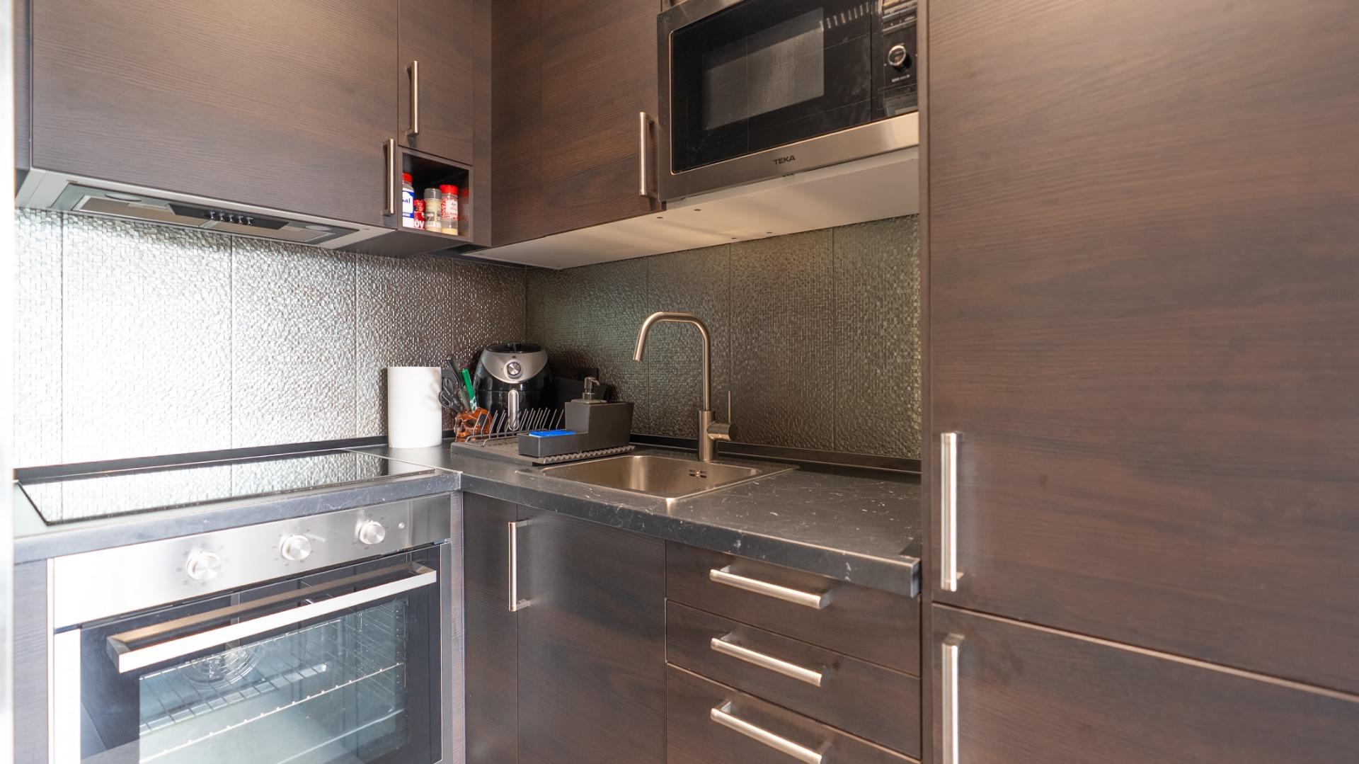 У квартирі ви знайдете простору спальню з двоспальним зонуванням, повністю обладнану ванну кімнату та зручну планування, яка створює відчуття затишку. Вітальня веде на терасу, ідеальну для відпочинку, читання або зустрічей.