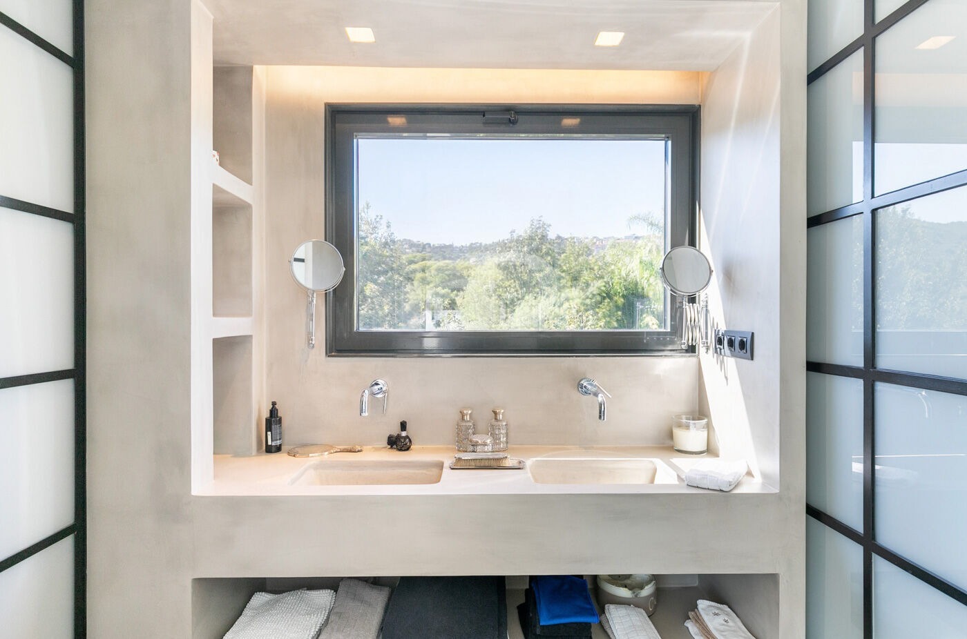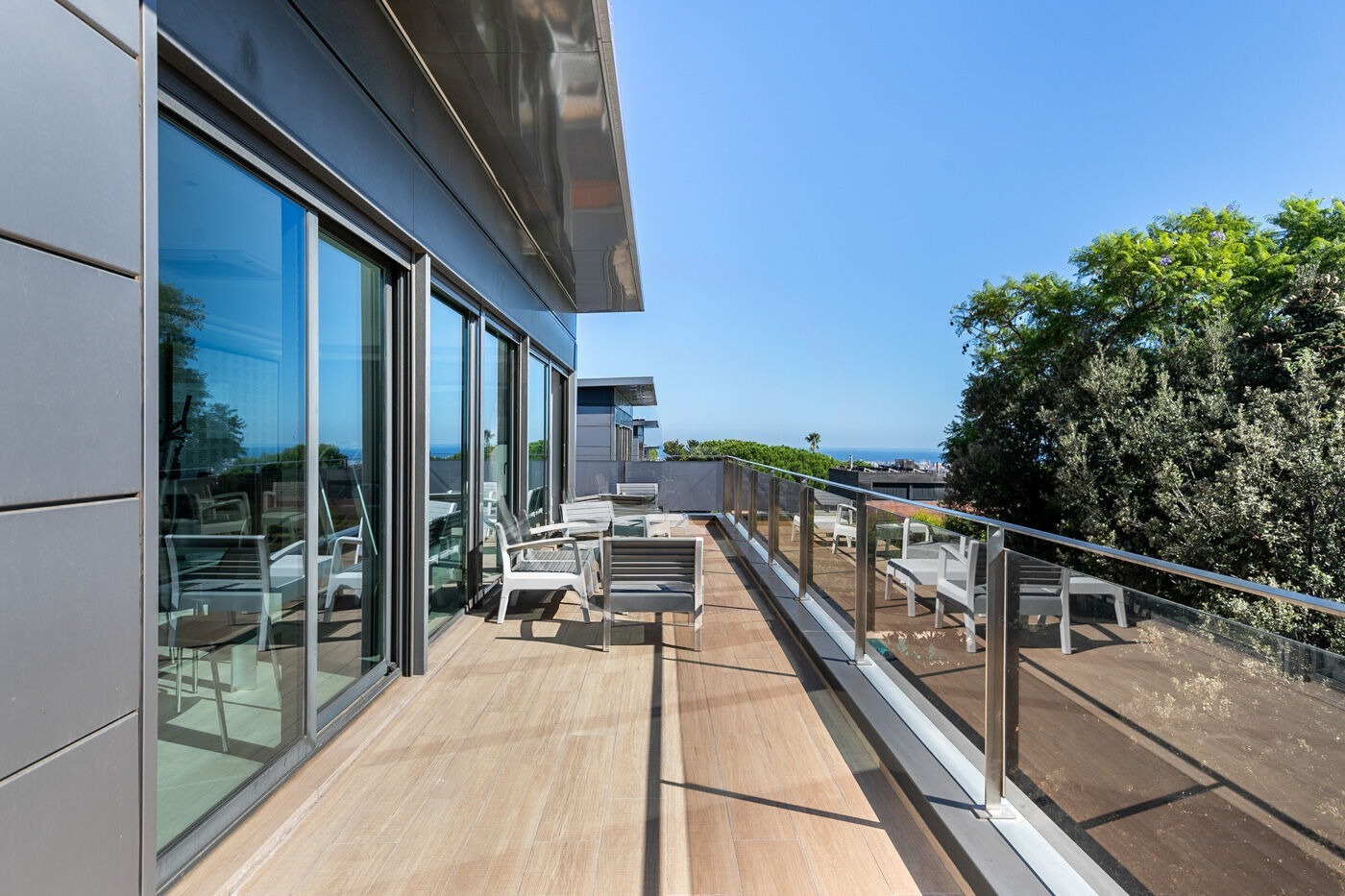 Будинок має кілька рівнів, де на цокольному поверсі передбачені просторий гараж на шість автомобілів, кімната для персоналу з ванною, пральня та велика комора. На основному поверсі розташовані світла вітальня-столова з виходом у сад і до басейну, сучасна кухня, кабінет і гостьовий санвузол. Перший поверх включає в себе вражаючий майстер-сьют з гардеробною та ванною, дві двомісні спальні з ванними кімнатами, а також багатофункціональну кімнату, яка може використовуватися як спортзал, кабінет або бібліотека. На верхньому поверсі розташована затишна вітальня, ванна кімната та вихід на тераси з видом на місто та море.