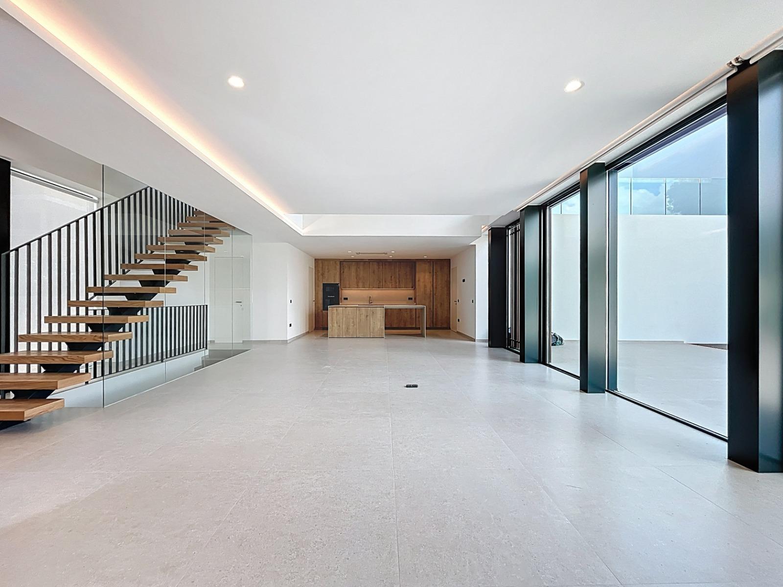 - Перший поверх: простора вітальня з обідньою зоною, дизайнерська кухня та вікна в два поверхи, а також гараж з прямим доступом до будинку.