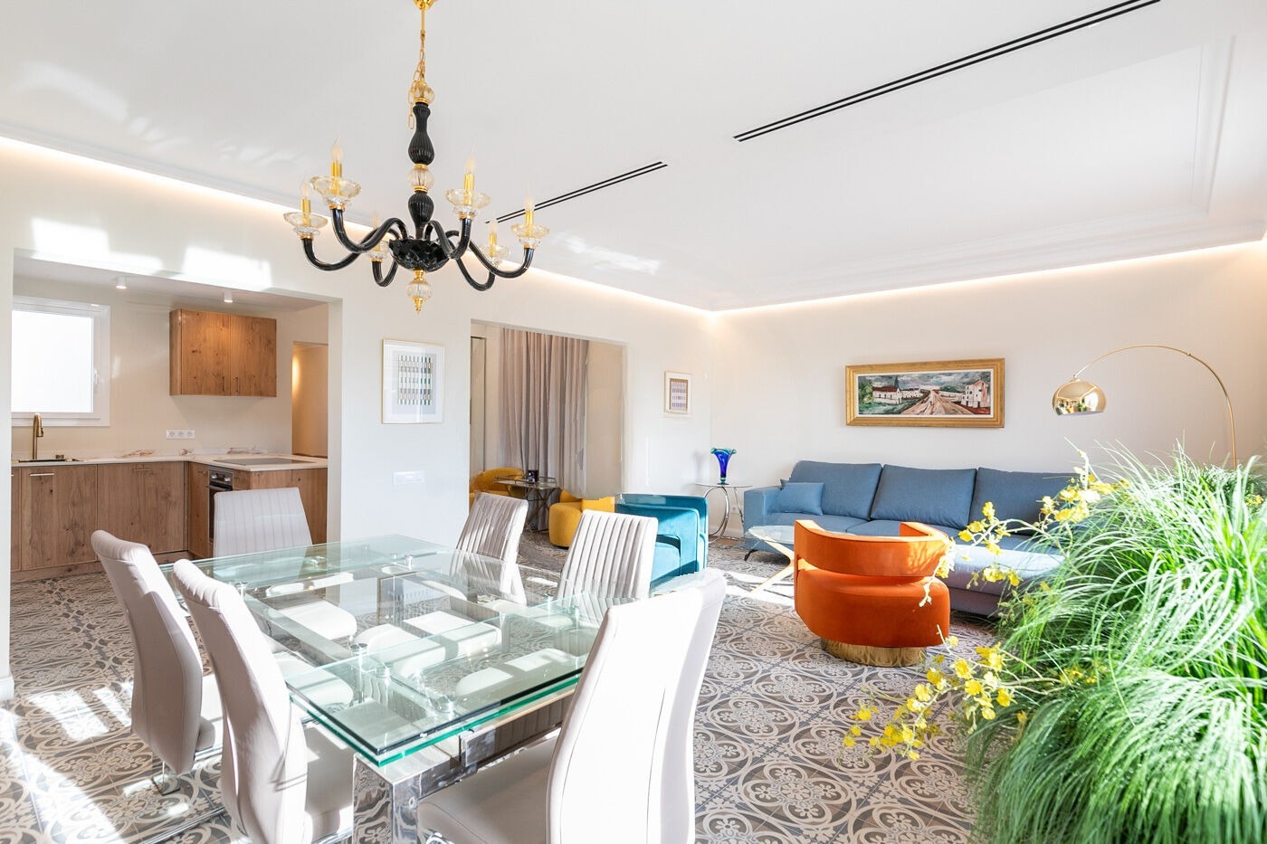 Зона денного перебування включає в себе затишну вітальню та сучасну кухню відкритого типу, повністю оснащену побутовою технікою останнього покоління. Простора столова створює ідеальний простір для зустрічей з друзями та родиною. Навколо багато ресторанів, бутиків та необхідних міських сервісів, що додає місцевого колориту та зручності.