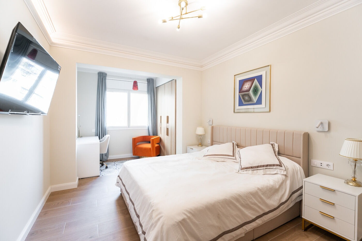 Пропонуємо вашій увазі елегантну квартиру в центрі Барселони на нещодавно облаштованій пішохідній вулиці. Цей просторий об’єкт площею 163 м² знаходиться на високому поверсі з південною орієнтацією, що забезпечує відмінне освітлення та комфортний мікроклімат. В квартирі передбачено чотири спальні, одна з яких має власний балкон, а також три ванні кімнати, оздоблені високоякісними матеріалами.