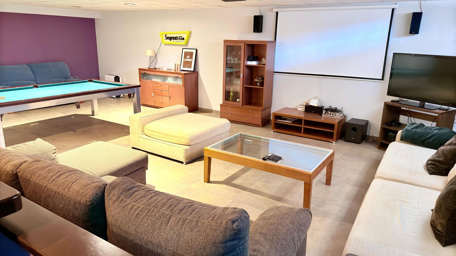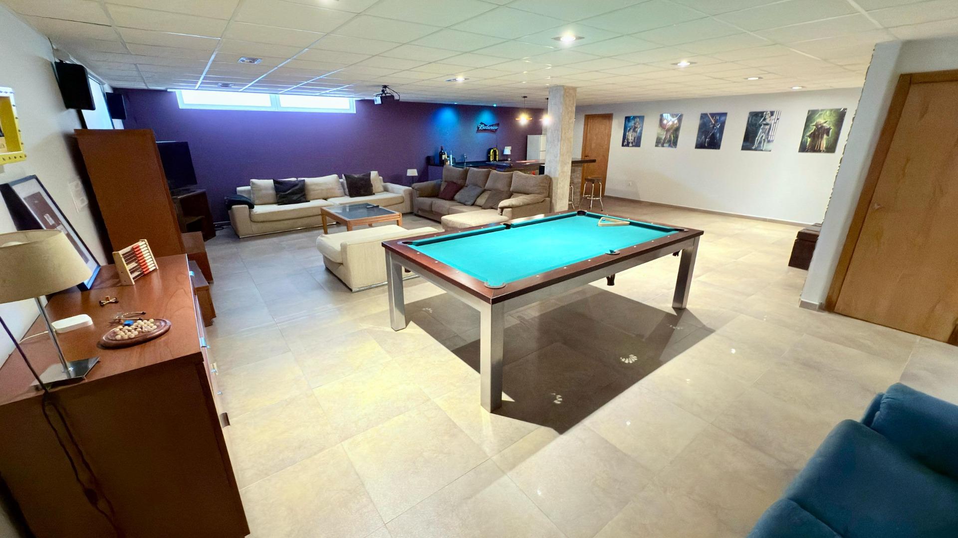 На напівпідвальному поверсі розташовані зони для відпочинку та розваг, включаючи більярдний стіл, дартс, бар та домашній кінотеатр. Тут знаходяться ще 2 спальні (одна з яких призначена під музичну студію) і кімната, придатна для будь-якого використання, а також велика ванна кімната з джакузі.