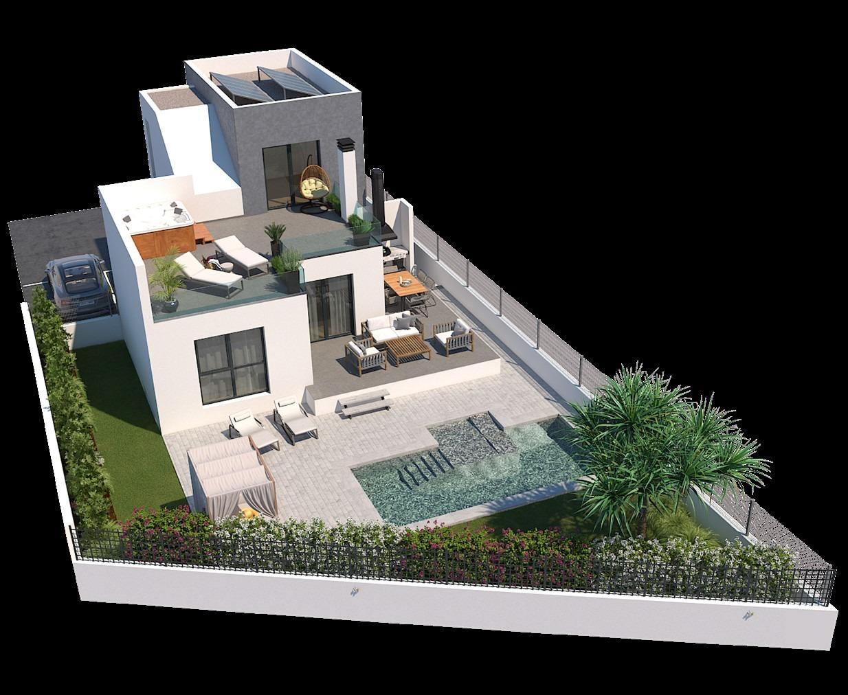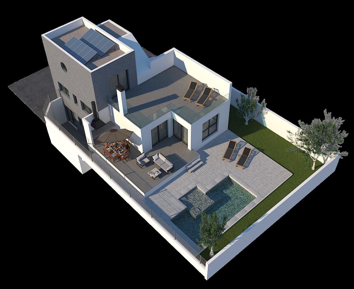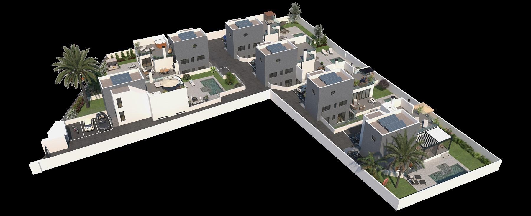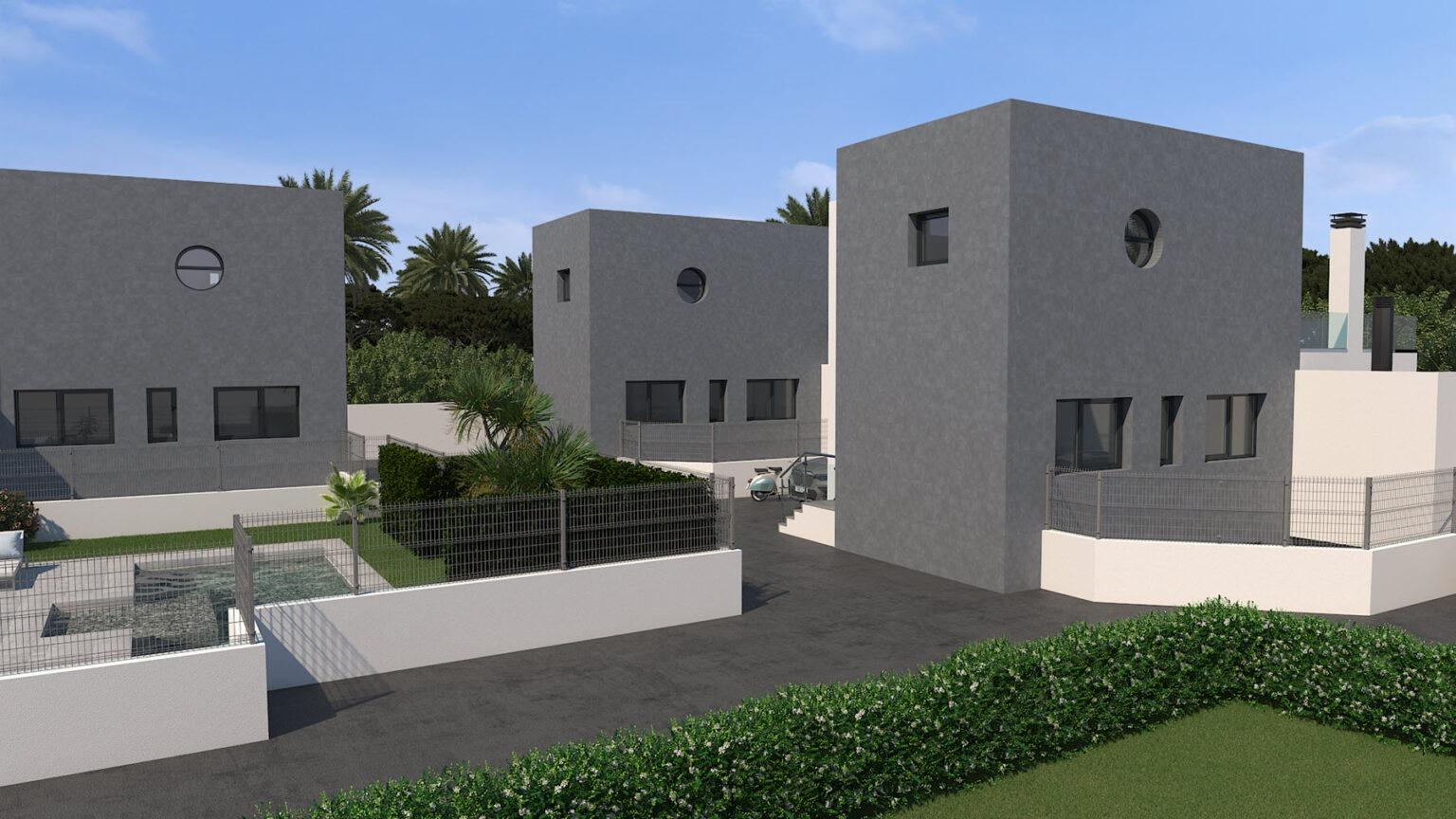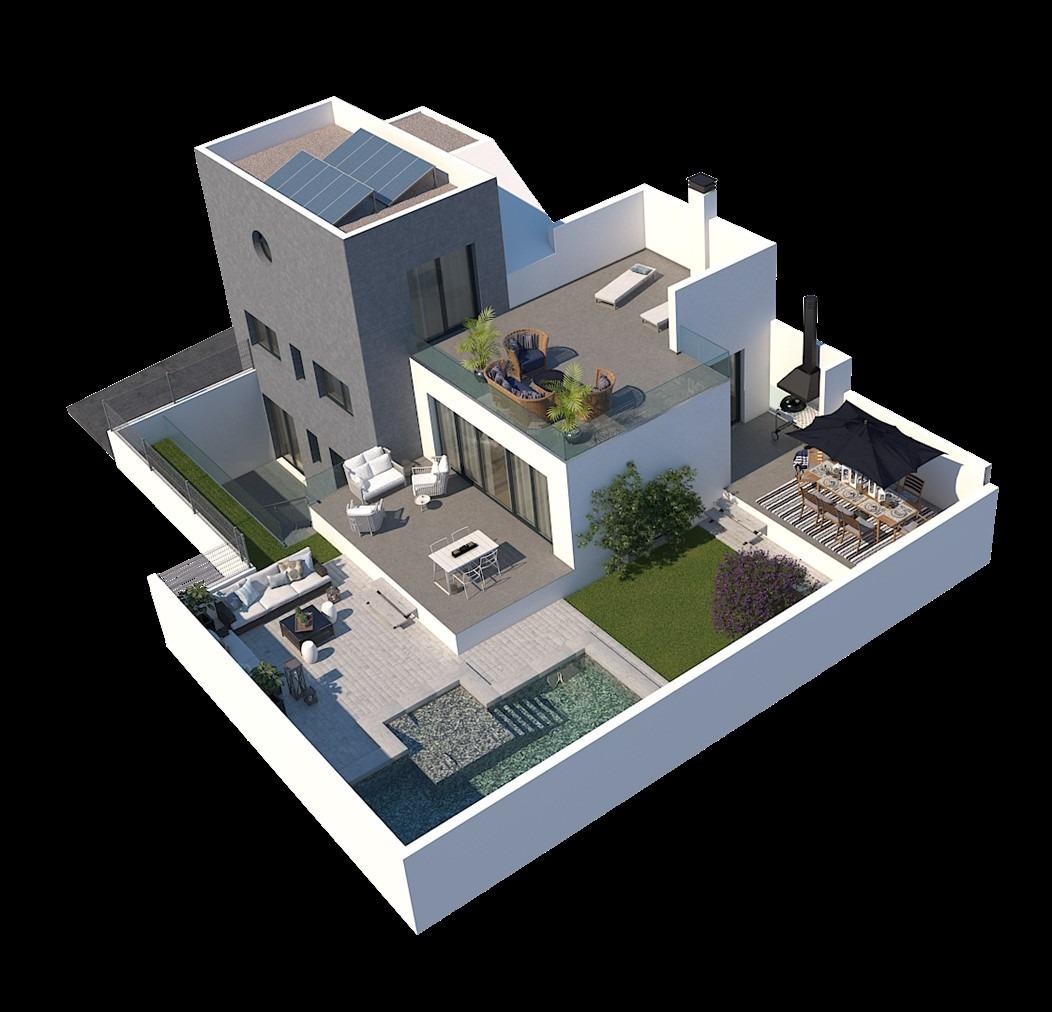 Представляємо вашій увазі новий проект, що складається з 6 сучасних вілл, розташованих в районі Ла Фонт, неподалік від пляжу Мучависта в Сан Хуан де Аліканте. Кожна вілла має три поверхи і включає в себе три спальні з двоспальними ліжками, одна з яких оформлена з гардеробною та ванною кімнатою. Вілли також оснащені трьома повністю обладнаними ванними кімнатами, просторою вітальнею з їдальнею та кухнею, а також терасами.