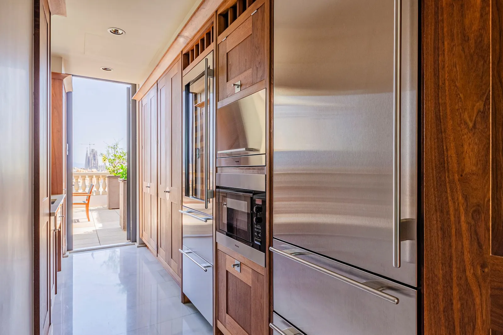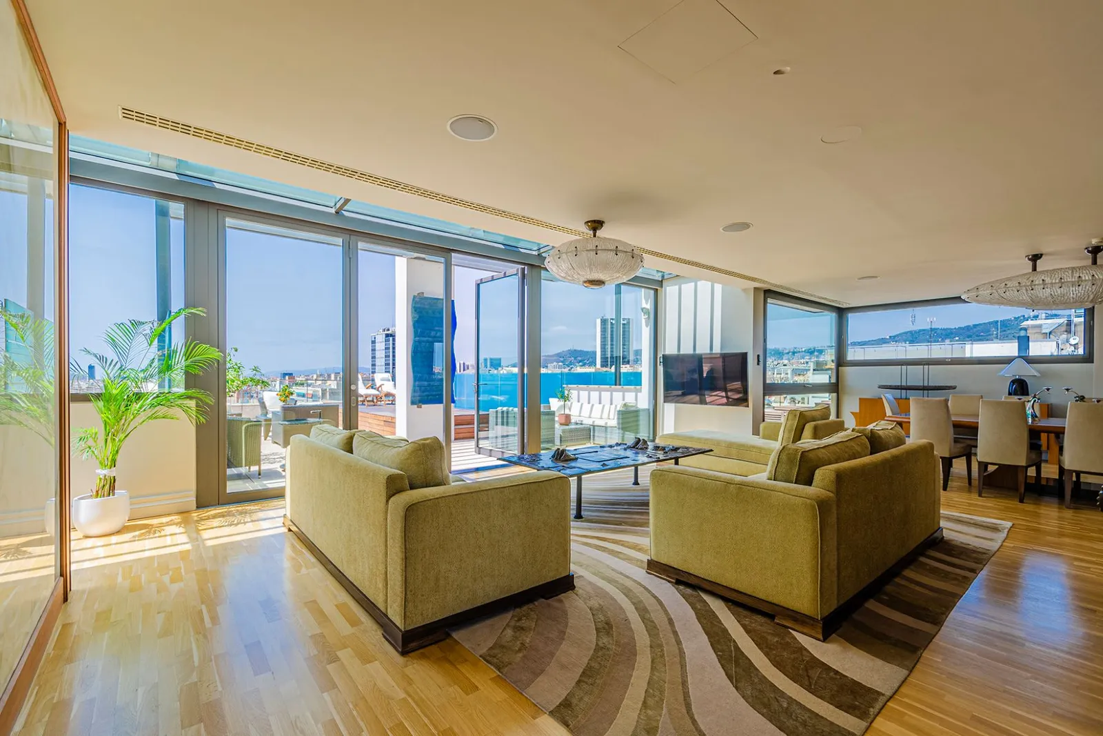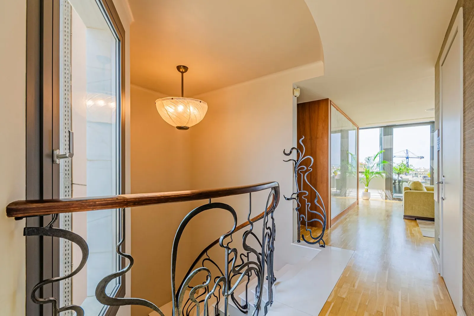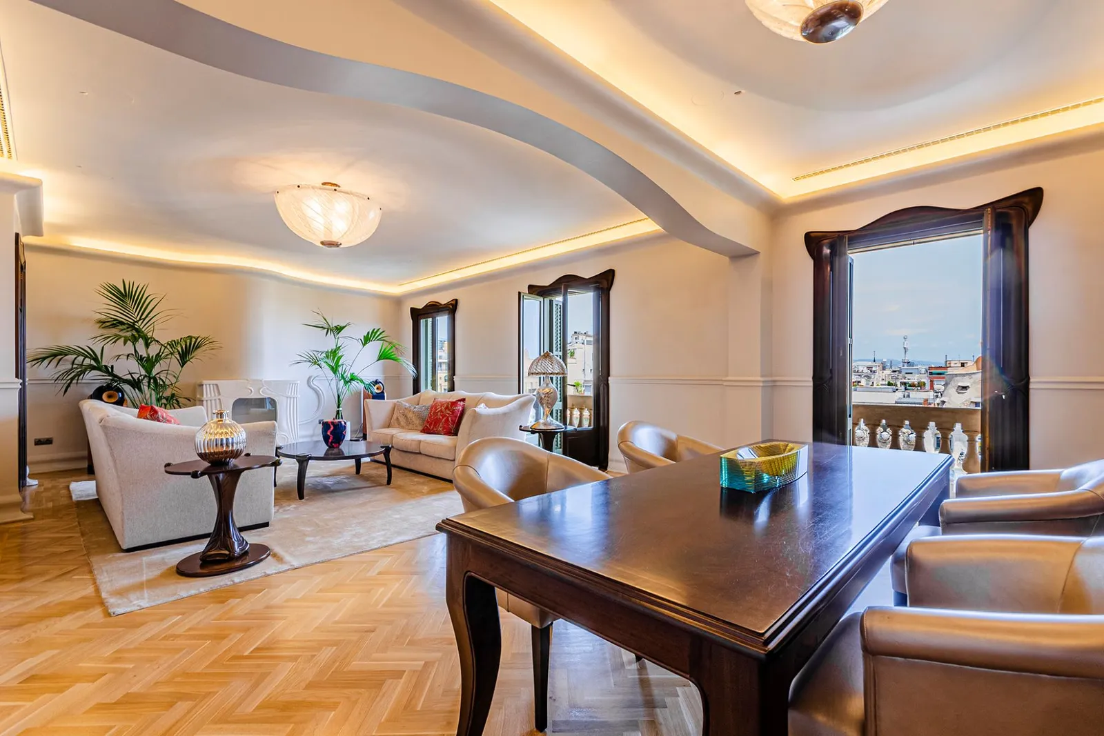 На верхнем этаже находятся просторные гостиная и столовая, кухня, несколько ванных комнат и терраса, с которой открывается панорамный вид на город. Также предусмотрен бассейн, доступный для использования в течение большей части года. Изящный кабинет с *панорамными окнами* расположился под красивым куполом и соединяется с двумя большими приватными террасами, выходящими на Пасео де Грасия.