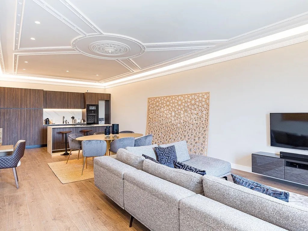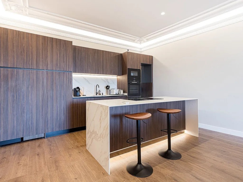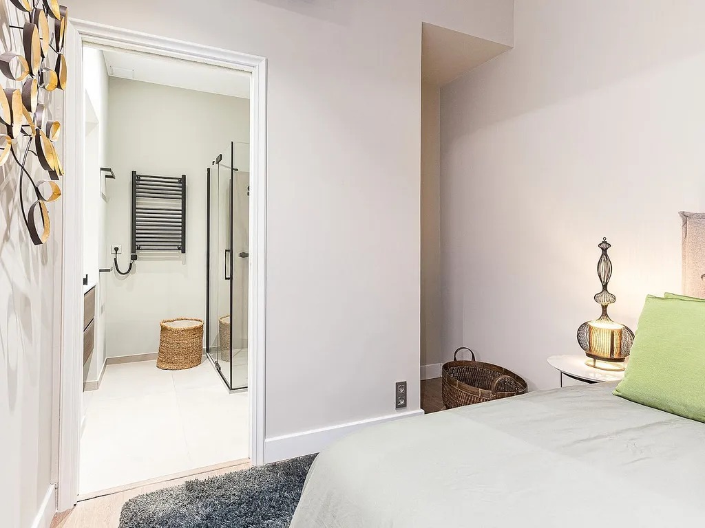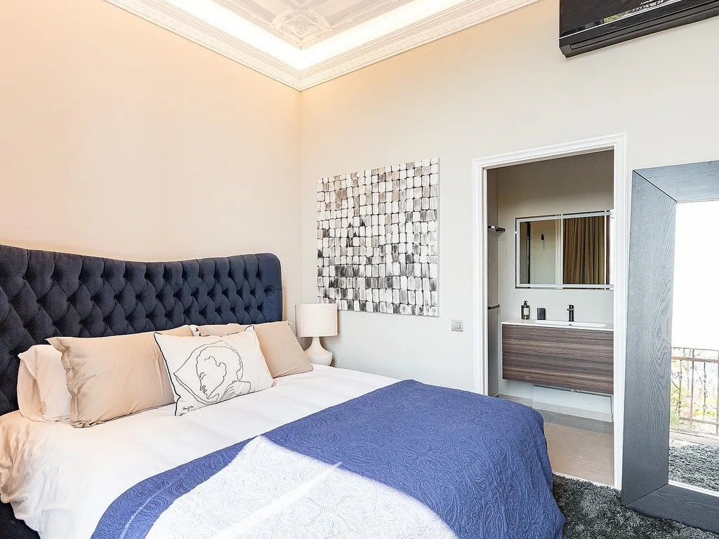 В квартирі передбачено дві спальні, кожна з яких має власну ванну кімнату. Головна спальня додатково обладнана гардеробною та вбудованими шафами, а також має вихід на окремий балкон. З просторової вітальні відкривається панорамний вид на Порт Маритим, а декоровані стелі з дизайнерським освітленням створюють затишну атмосферу. Додатково в квартирі встановлені паркетні підлоги та кондиціонери з функцією обігріву.