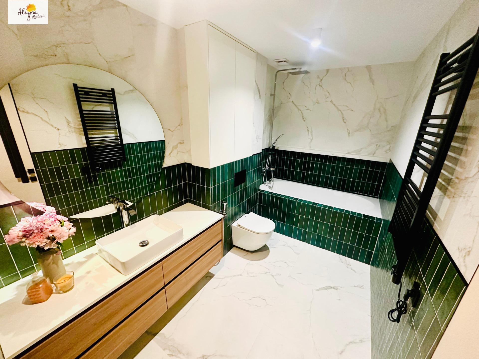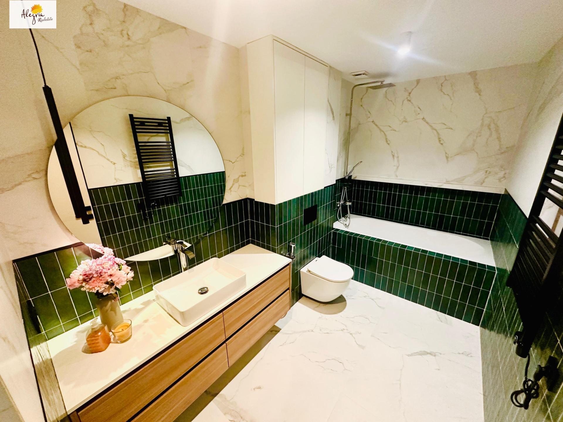 Квартира включает в себя 2 уютные спальни и 2 ванные комнаты (одна с ванной, другая с душевой кабиной в тропическом стиле). Просторная гостиная с панорамными окнами открывает прямую вид на море, а американская кухня полностью оборудована, включая посудомоечную машину. Для дополнительного комфорта предусмотрен подогрев полов в ванных комнатах, а современная мебель и техника находятся в абсолютно новом состоянии. Квартира полностью готова к заселению.