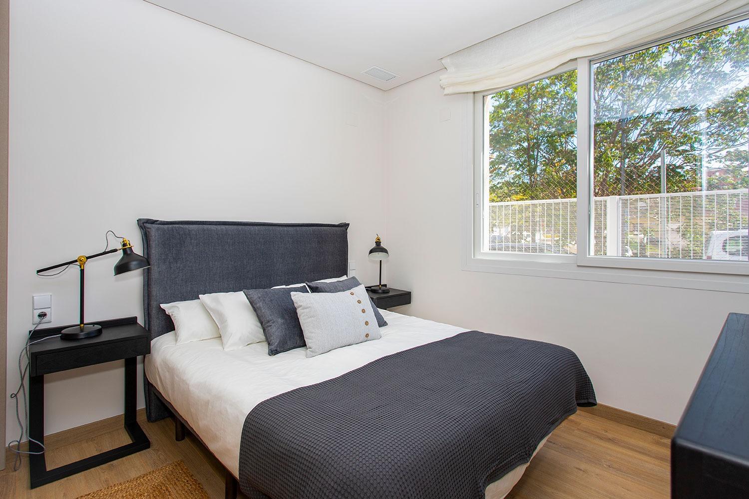 Внутри расположены три просторные двуспальные комнаты и три современных полностью оборудованных санузла, что обеспечивает максимальный комфорт. Благодаря юго-западной ориентации, помещения наполнены естественным светом на протяжении всего дня. Кухня полностью оборудована и станет отличным местом для любителей кулинарии. Особое внимание стоит уделить качественным отделочным материалам, включая внутренние двери из белого лака и внешние алюминиевые рамы со стеклом Climalit, которые придают дому современный вид и долговечность.